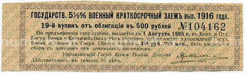 Купон от облигации 500 рублей 1916 года «Внутренний государственный краткосрочный заем» (Артикул: T11-29987): подробные характеристики, качественные фотографии в высоком разрешении, низкая цена.