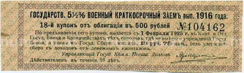 Интернет магазин «Нумизмат» предлагает приобрести Купон от облигации 500 рублей 1916 года «Внутренний государственный краткосрочный заем».