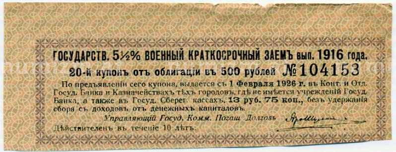 Купон от облигации 500 рублей 1916 года «Внутренний государственный краткосрочный заем» (Артикул: T11-29997): подробные характеристики, качественные фотографии в высоком разрешении, низкая цена.