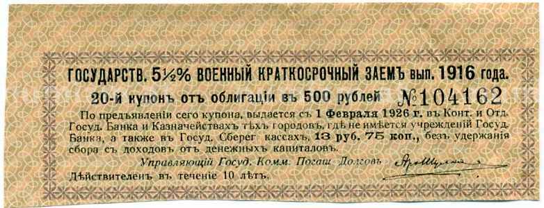 Купон от облигации 500 рублей 1916 года «Внутренний государственный краткосрочный заем» (Артикул: T11-29998): подробные характеристики, качественные фотографии в высоком разрешении, низкая цена.