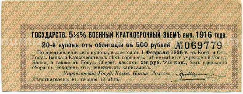 Купон от облигации 500 рублей 1916 года «Внутренний государственный краткосрочный заем» (Артикул: T11-29999): подробные характеристики, качественные фотографии в высоком разрешении, низкая цена.