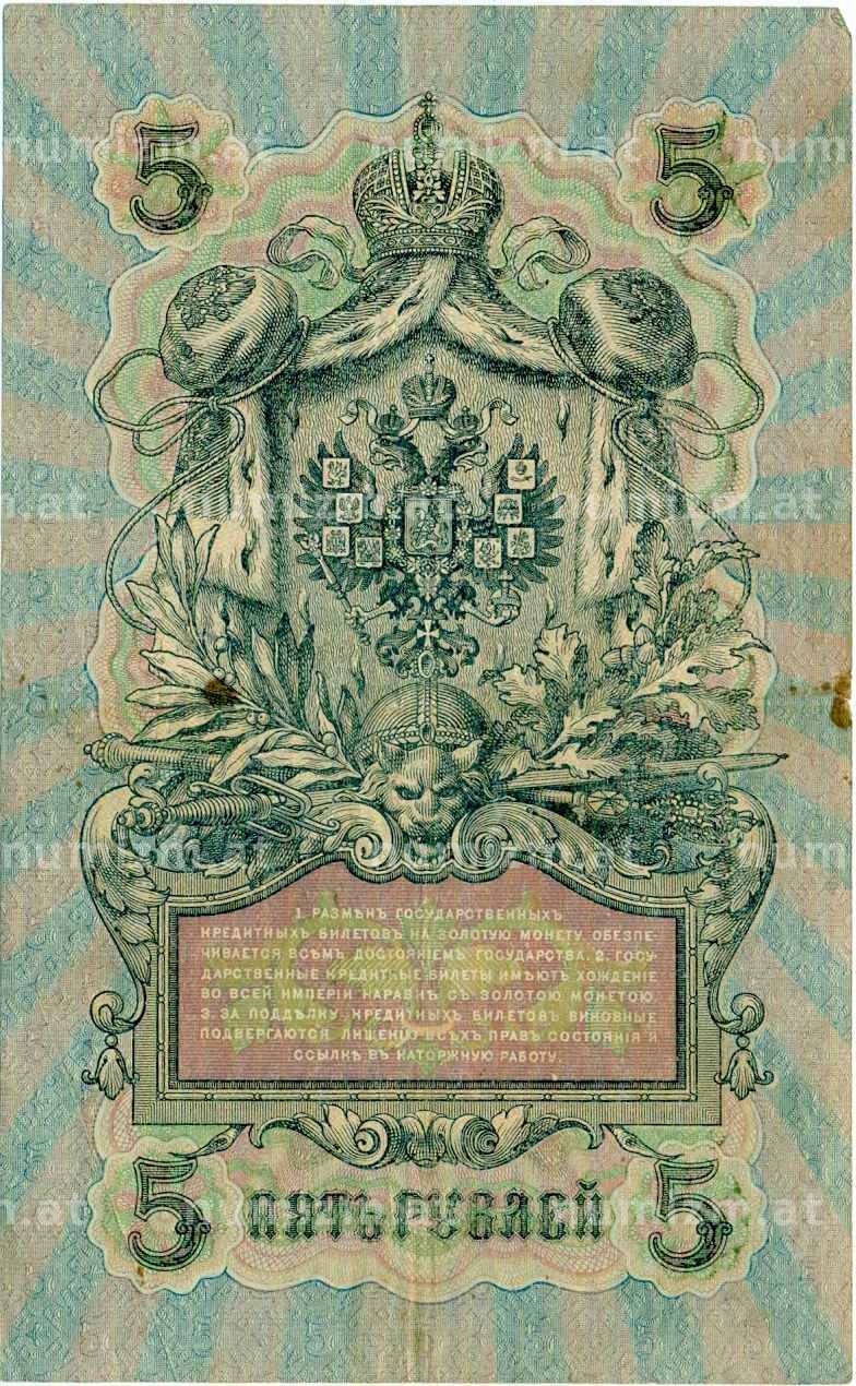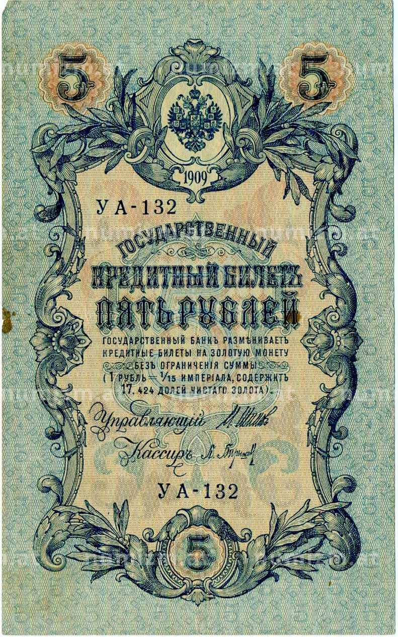 Банкнота 5 рублей 1909 года Шипов / Барышев (Артикул: T11-30015): подробные характеристики, качественные фотографии в высоком разрешении, низкая цена.