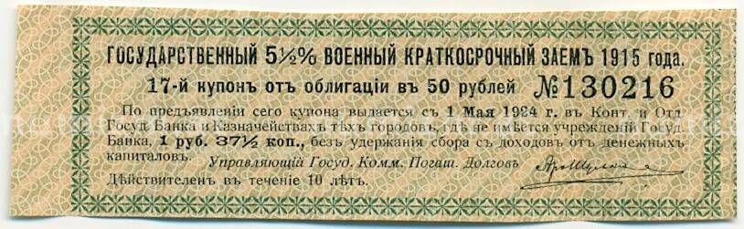 Купон от облигации 50 рублей 1915 года «Государственный военный краткосрочный заем» (Артикул: T11-30256): подробные характеристики, качественные фотографии в высоком разрешении, низкая цена.