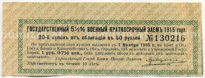 Купить Купон от облигации 50 рублей 1915 года «Государственный военный краткосрочный заем» по привлекательной цене можно в нашем интернет-магазине — Вам достаточно оформить заказ на сайте. Все монеты, представленные в каталоге, находятся в наличии на нашем складе.
