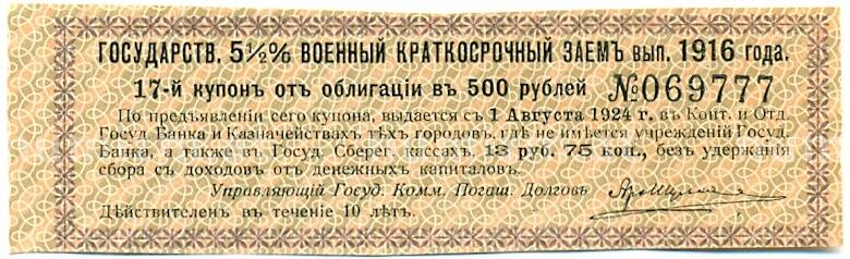 Купон от облигации 500 рублей 1916 года «Государственный военный краткосрочный заем» (Артикул: T11-30260): подробные характеристики, качественные фотографии в высоком разрешении, низкая цена.