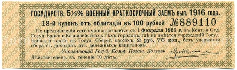 Купон от облигации 100 рублей 1916 года «Государственный военный краткосрочный заем» (Артикул: T11-30264): подробные характеристики, качественные фотографии в высоком разрешении, низкая цена.