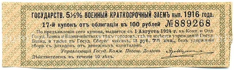 Купон от облигации 100 рублей 1916 года «Государственный военный краткосрочный заем» (Артикул: T11-30265): подробные характеристики, качественные фотографии в высоком разрешении, низкая цена.