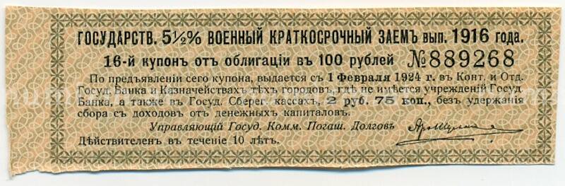 Купон от облигации 100 рублей 1916 года «Государственный военный краткосрочный заем» (Артикул: T11-30266): подробные характеристики, качественные фотографии в высоком разрешении, низкая цена.