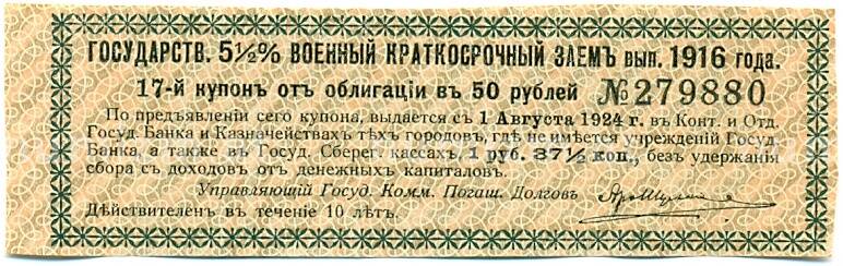 Купон от облигации 50 рублей 1916 года «Государственный военный краткосрочный заем» (Артикул: T11-30267): подробные характеристики, качественные фотографии в высоком разрешении, низкая цена.