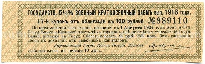 Купон от облигации 100 рублей 1916 года «Государственный военный краткосрочный заем» (Артикул: T11-30268): подробные характеристики, качественные фотографии в высоком разрешении, низкая цена.