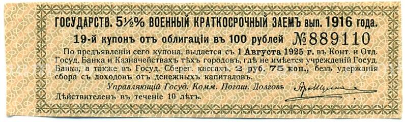 Купон от облигации 100 рублей 1916 года «Государственный военный краткосрочный заем» (Артикул: T11-30270): подробные характеристики, качественные фотографии в высоком разрешении, низкая цена.