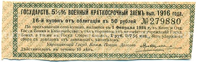 Купон от облигации 50 рублей 1916 года «Государственный военный краткосрочный заем» [Артикул: T11-30272]