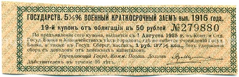 Купон от облигации 50 рублей 1916 года «Государственный военный краткосрочный заем» (Артикул: T11-30273): подробные характеристики, качественные фотографии в высоком разрешении, низкая цена.
