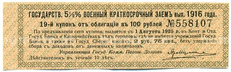 Купон от облигации 100 рублей 1916 года «Государственный военный краткосрочный заем» (Артикул: T11-30276): подробные характеристики, качественные фотографии в высоком разрешении, низкая цена.
