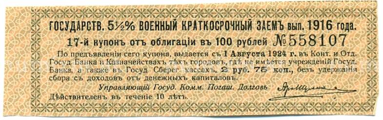 Купон от облигации 100 рублей 1916 года «Государственный военный краткосрочный заем» (Артикул: T11-30278): подробные характеристики, качественные фотографии в высоком разрешении, низкая цена.