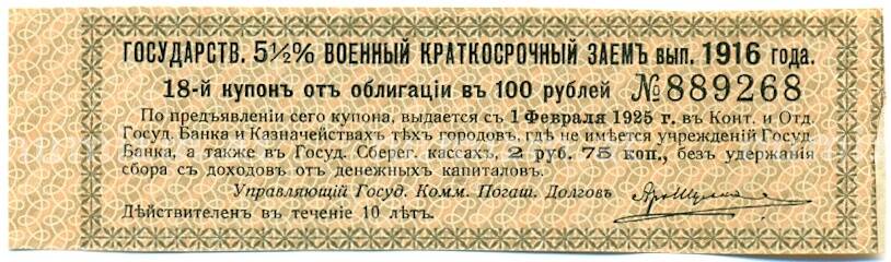 Купон от облигации 100 рублей 1916 года «Государственный военный краткосрочный заем» (Артикул: T11-30280): подробные характеристики, качественные фотографии в высоком разрешении, низкая цена.