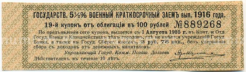 Купон от облигации 100 рублей 1916 года «Государственный военный краткосрочный заем» (Артикул: T11-30281): подробные характеристики, качественные фотографии в высоком разрешении, низкая цена.