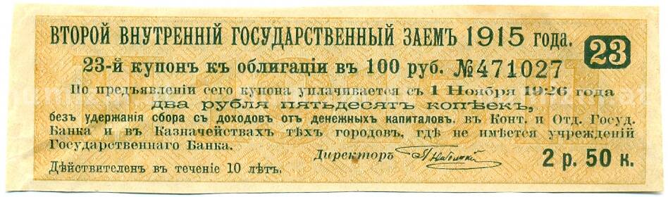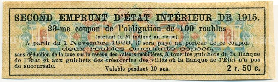 Купон от облигации 100 рублей 1915 года «Второй внутренний государственный заем» (Артикул: T11-30285): подробные характеристики, качественные фотографии в высоком разрешении, низкая цена.