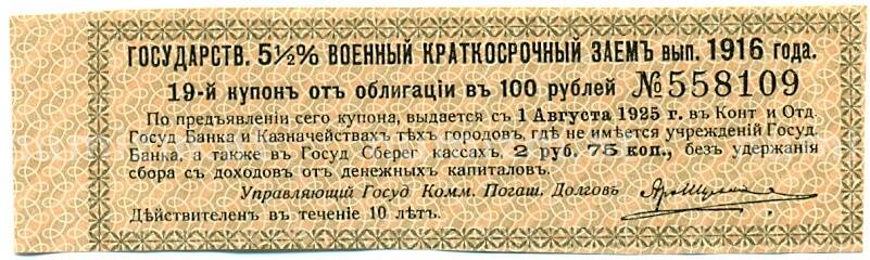 Купить Купон от облигации 100 рублей 1916 года «Государственный военный краткосрочный заем» по привлекательной цене можно в нашем интернет-магазине — Вам достаточно оформить заказ на сайте. Все монеты, представленные в каталоге, находятся в наличии на нашем складе.