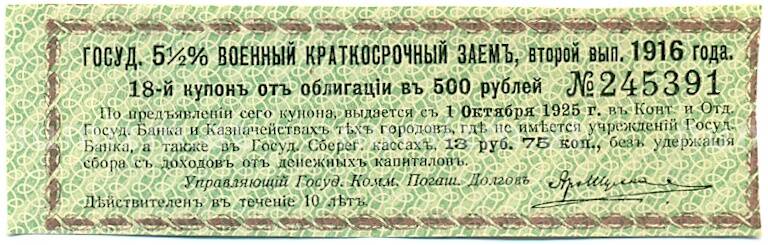 Купон от облигации 500 рублей 1916 года «Государственный военный краткосрочный заем» (Артикул: T11-30310): подробные характеристики, качественные фотографии в высоком разрешении, низкая цена.