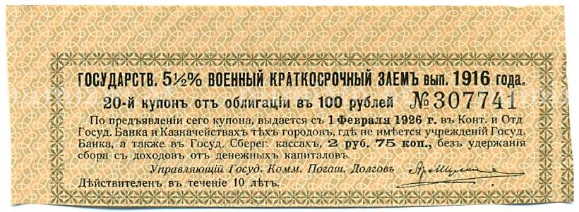 Купон от облигации 100 рублей 1916 года «Государственный военный краткосрочный заем» (Артикул: T11-30312): подробные характеристики, качественные фотографии в высоком разрешении, низкая цена.