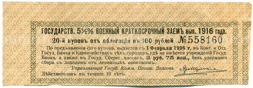 Купон от облигации 100 рублей 1916 года «Государственный военный краткосрочный заем» (Артикул: T11-30317): подробные характеристики, качественные фотографии в высоком разрешении, низкая цена.