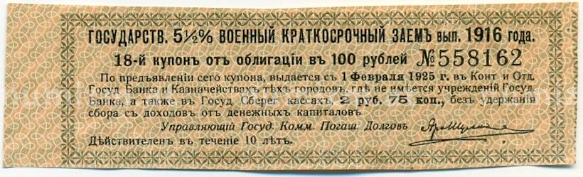 Купон от облигации 100 рублей 1916 года «Государственный военный краткосрочный заем» (Артикул: T11-30325): подробные характеристики, качественные фотографии в высоком разрешении, низкая цена.