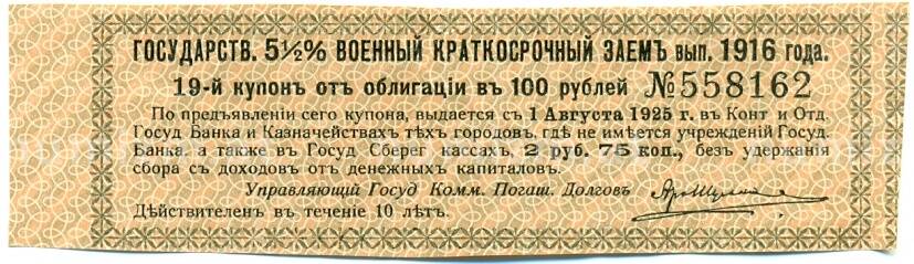 Купон от облигации 100 рублей 1916 года «Государственный военный краткосрочный заем» (Артикул: T11-30327): подробные характеристики, качественные фотографии в высоком разрешении, низкая цена.