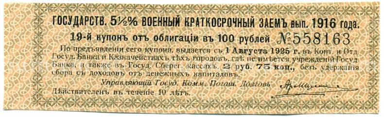 Купить Купон от облигации 100 рублей 1916 года «Государственный военный краткосрочный заем» по привлекательной цене можно в нашем интернет-магазине — Вам достаточно оформить заказ на сайте. Все монеты, представленные в каталоге, находятся в наличии на нашем складе.