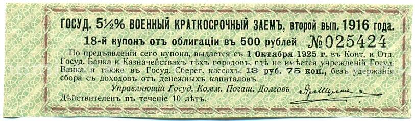 Купон от облигации 500 рублей 1916 года «Государственный военный краткосрочный заем» (Артикул: T11-30342): подробные характеристики, качественные фотографии в высоком разрешении, низкая цена.