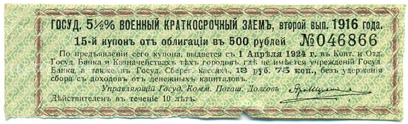 Купить Купон от облигации 500 рублей 1916 года «Государственный военный краткосрочный заем» по привлекательной цене можно в нашем интернет-магазине — Вам достаточно оформить заказ на сайте. Все монеты, представленные в каталоге, находятся в наличии на нашем складе.