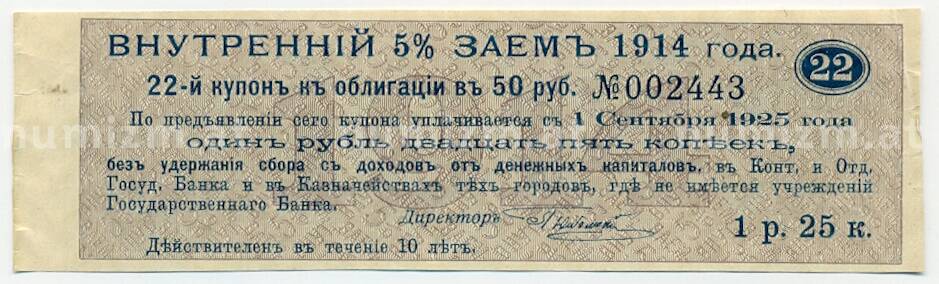Интернет магазин «Нумизмат» предлагает приобрести Купон от облигации 50 рублей 1914 года «Государственный военный краткосрочный заем».