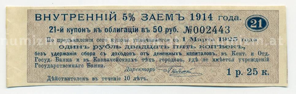 20.01.2025Интернет магазин «Нумизмат» предлагает приобрести Купон от облигации 50 рублей 1914 года «Государственный военный краткосрочный заем».