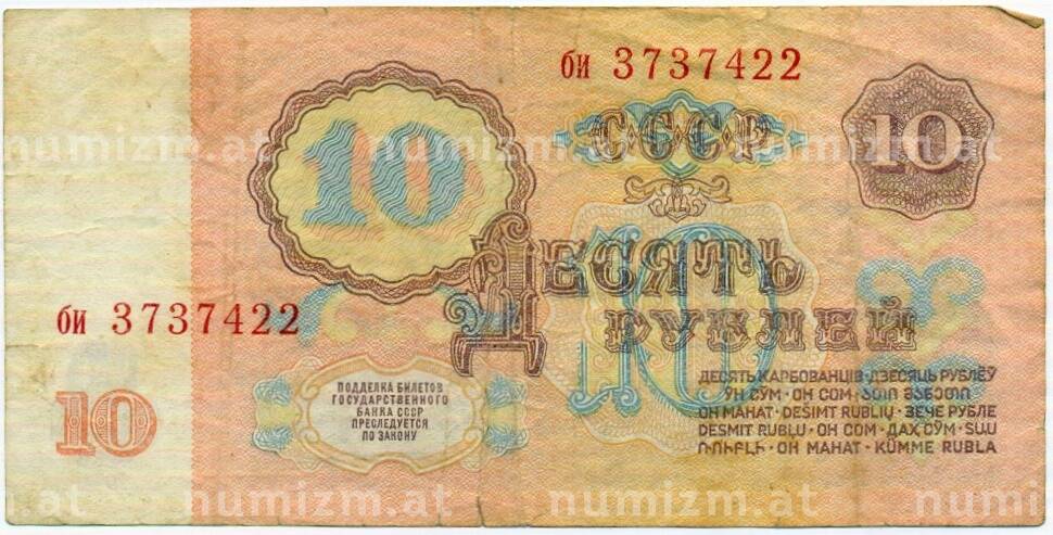 • Банкнота 10 рублей 1961 года (Артикул: T11-32035) — Фото №1 Банкнота 10 рублей 1961 года (Артикул: T11-32035) — Фото №2