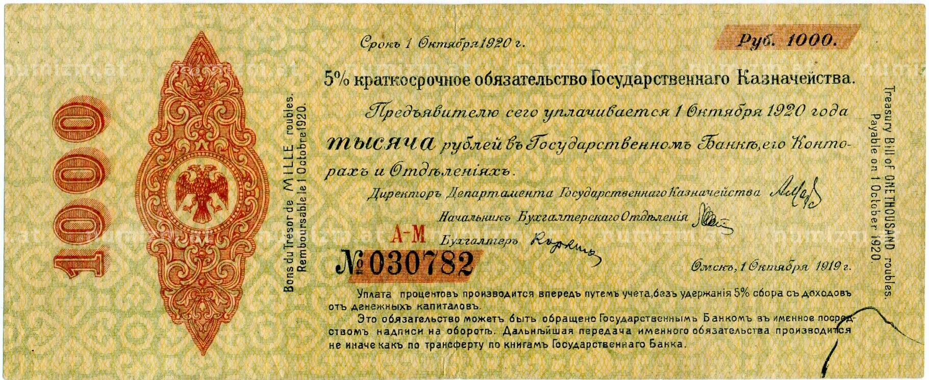 Купить 1000 рублей 1919 года Краткосрочное обязательство Государственного Казначейства (Омск) по привлекательной цене можно в нашем интернет-магазине — Вам достаточно оформить заказ на сайте. Все монеты, представленные в каталоге, находятся в наличии на нашем складе.
