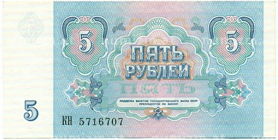 Банкнота 5 рублей 1991 года (Артикул: T11-32615): подробные характеристики, качественные фотографии в высоком разрешении, низкая цена.