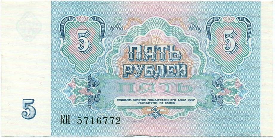 Банкнота 5 рублей 1991 года (Артикул: T11-32628): подробные характеристики, качественные фотографии в высоком разрешении, низкая цена.