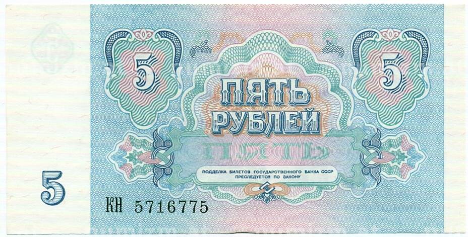 Банкнота 5 рублей 1991 года (Артикул: T11-32631): подробные характеристики, качественные фотографии в высоком разрешении, низкая цена.