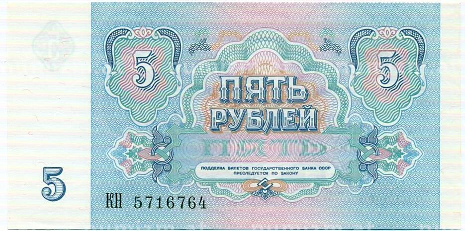 Банкнота 5 рублей 1991 года (Артикул: T11-32657): подробные характеристики, качественные фотографии в высоком разрешении, низкая цена.