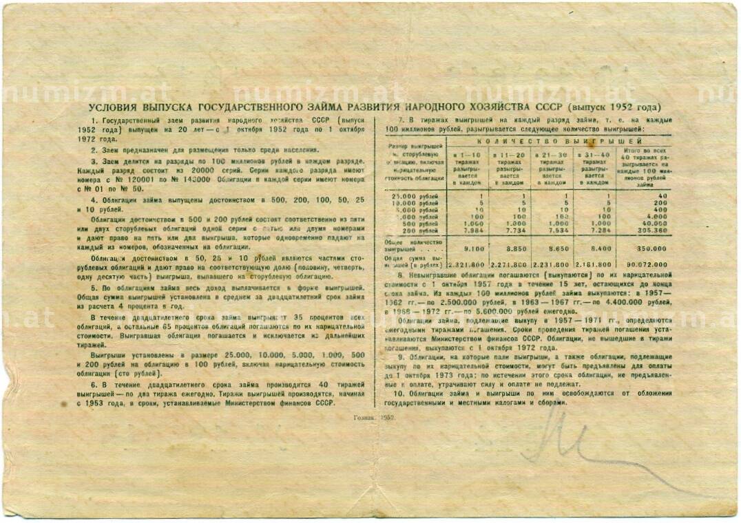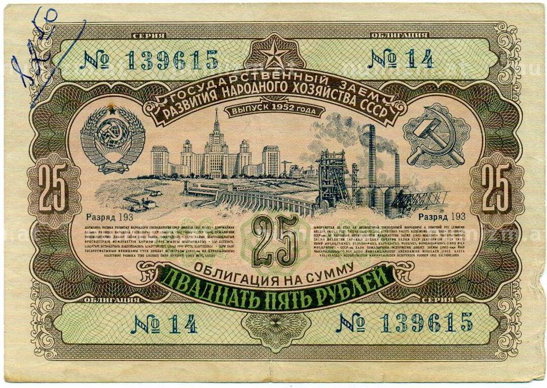 20.01.2025Интернет магазин «Нумизмат» предлагает приобрести Облигация 25 рублей 1952 года «Заем развития народного хозяйства».