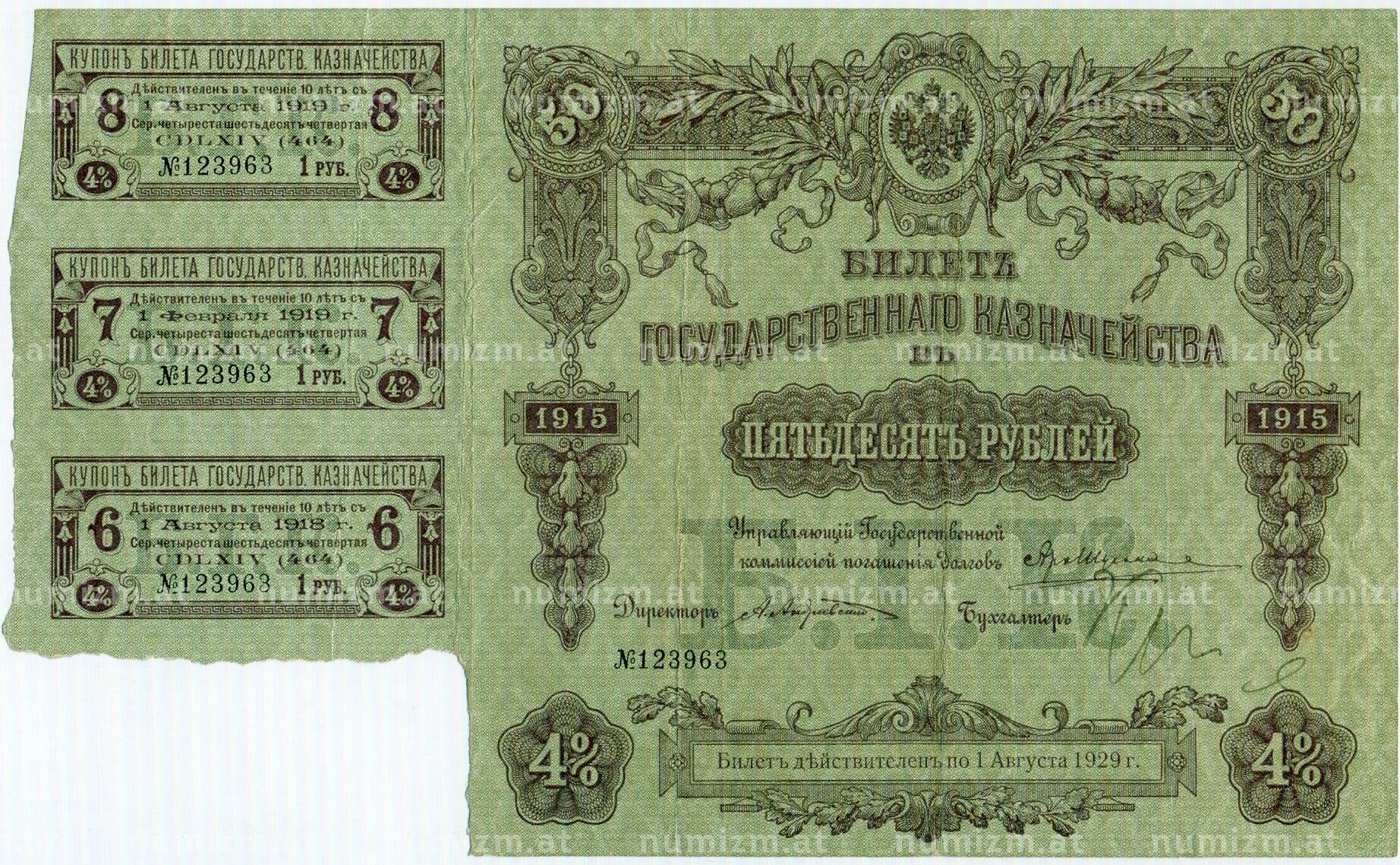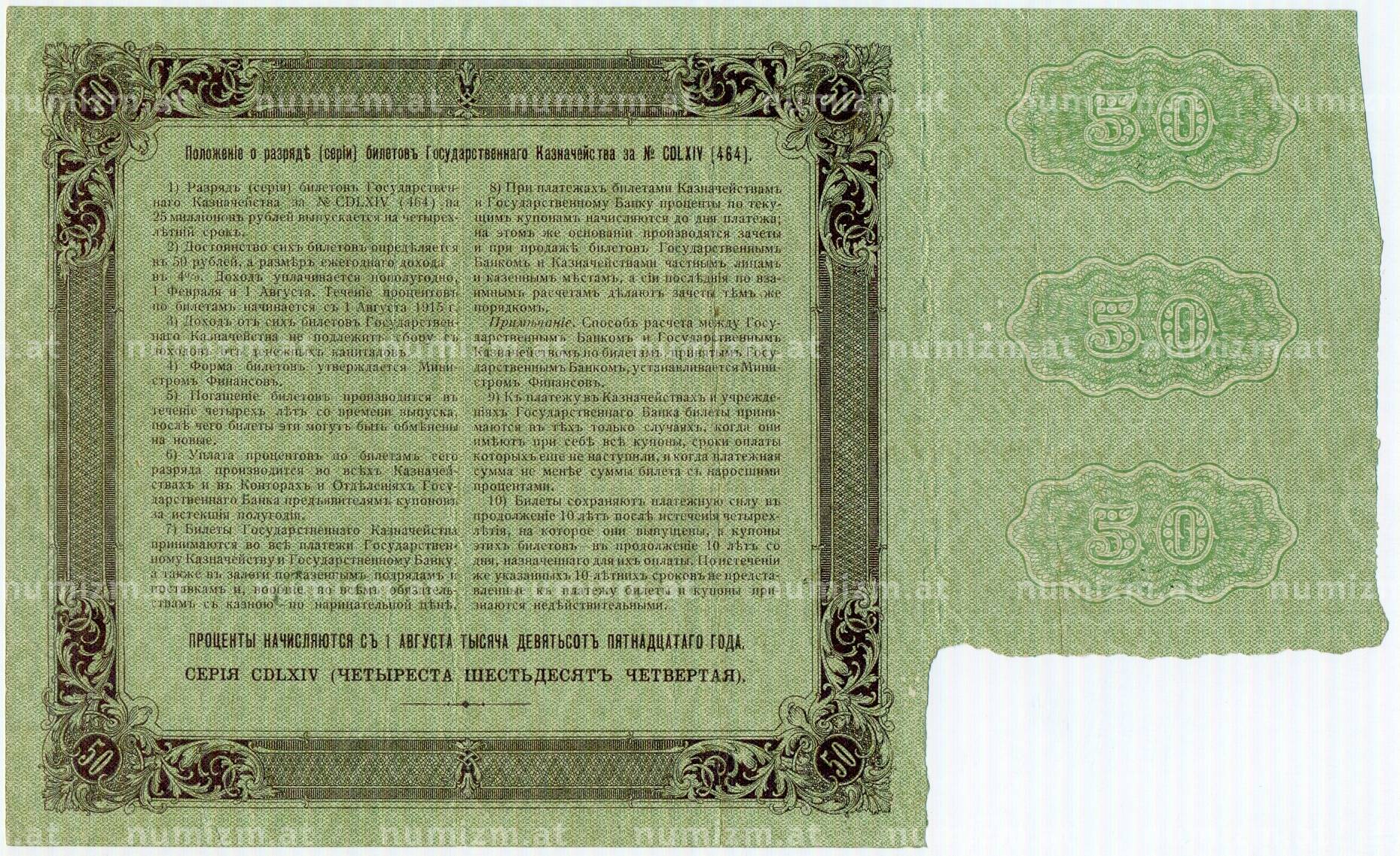 20.01.2025Интернет магазин «Нумизмат» предлагает приобрести Облигация 50 рублей 1915 года «Билет Государственного Казначейства».