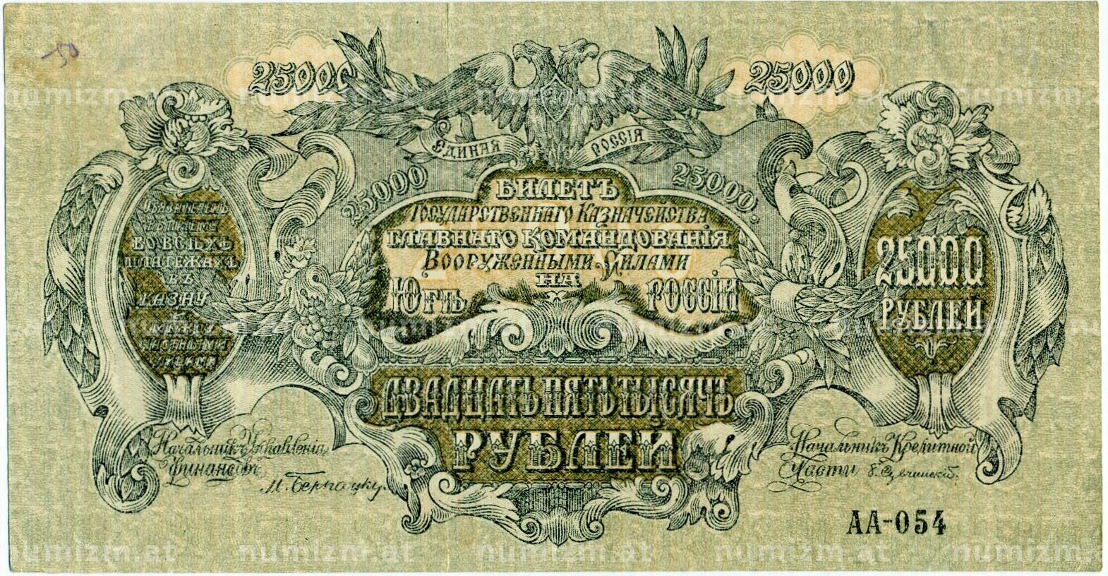 20.01.2025Интернет магазин «Нумизмат» предлагает приобрести 25000 рублей 1920 года Вооруженные силы на Юге России.