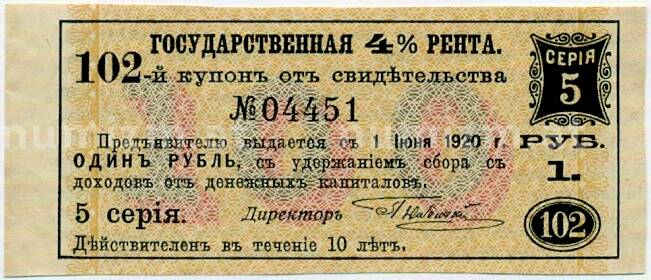 20.01.2025Интернет магазин «Нумизмат» предлагает приобрести Купон номиналом в 1 рубль 1920 года «Государственная рента».