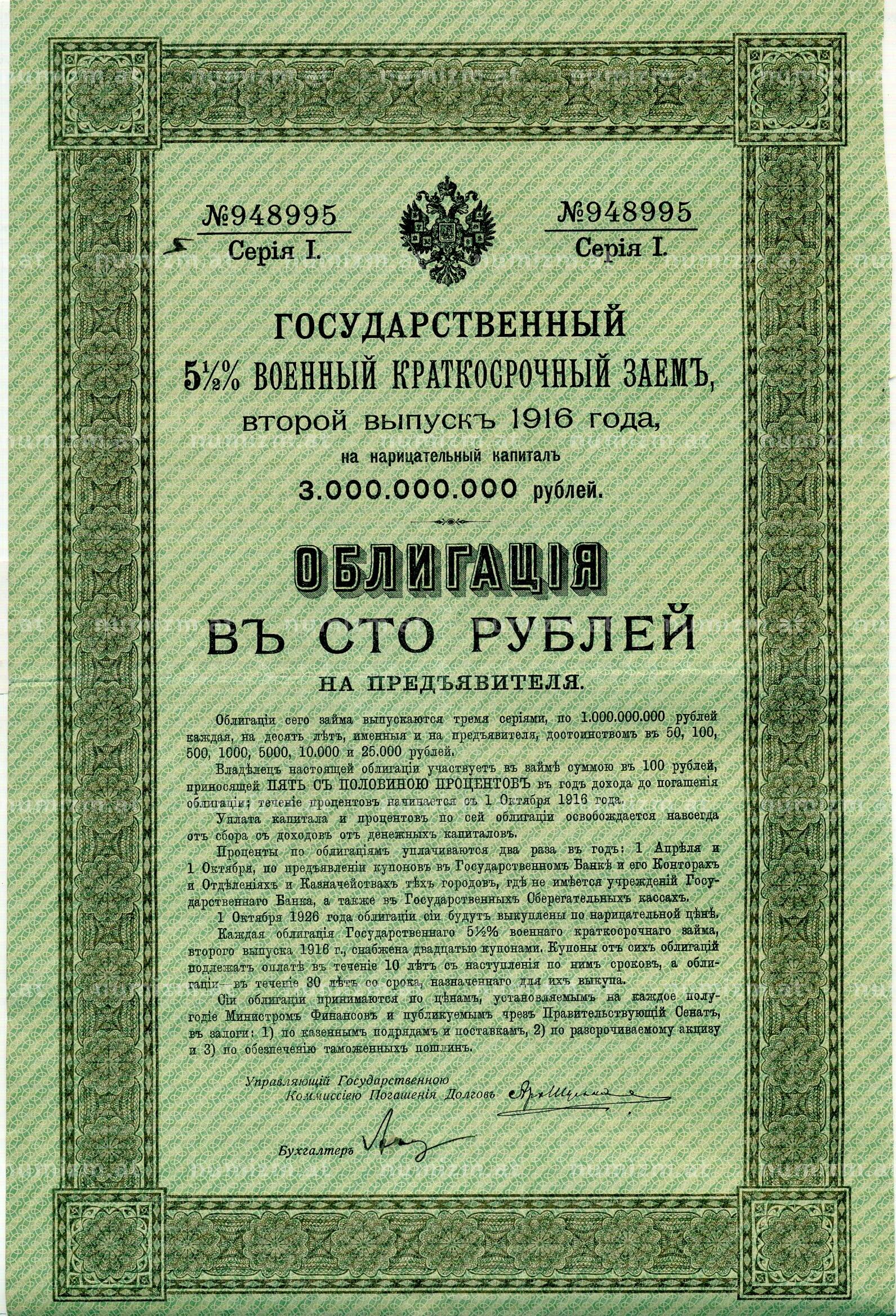 20.01.2025Интернет магазин «Нумизмат» предлагает приобрести Облигация 100 рублей 1916 года «Военный краткосрочый заем».