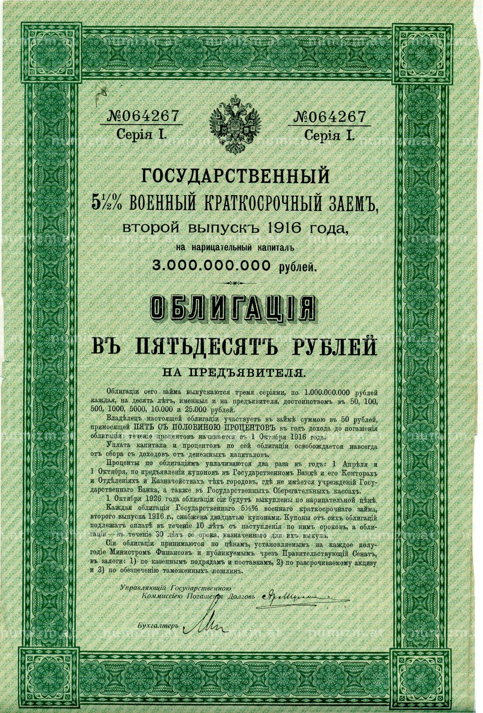 Облигация 50 рублей 1916 года «Военный краткосрочый заем» (Артикул: T11-33483): подробные характеристики, качественные фотографии в высоком разрешении, низкая цена.