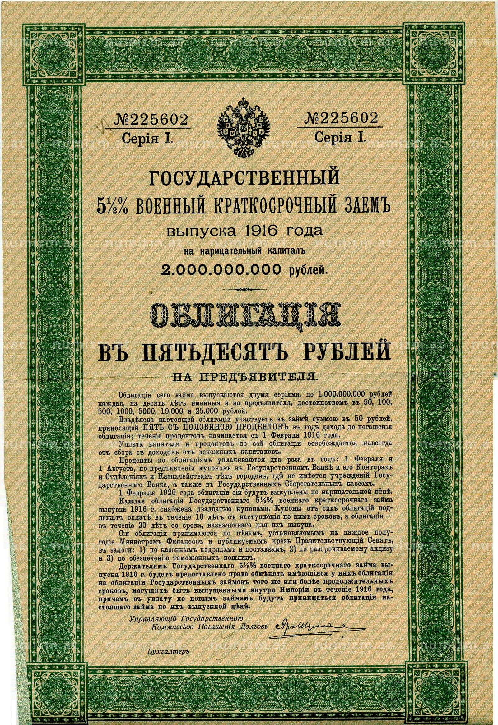 Облигация 50 рублей 1916 года «Военный краткосрочый заем» (Артикул: T11-33491): подробные характеристики, качественные фотографии в высоком разрешении, низкая цена.