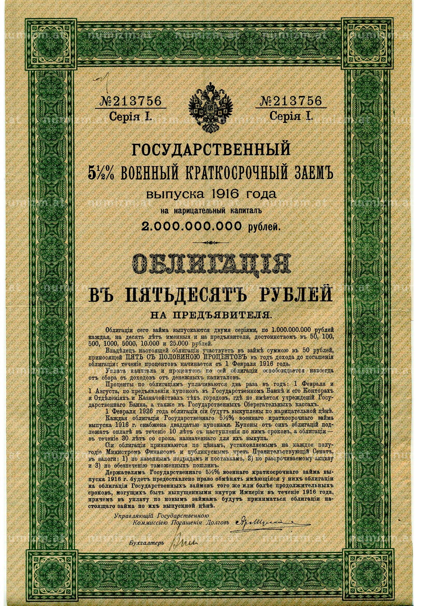 Облигация 50 рублей 1916 года «Военный краткосрочый заем» (Артикул: T11-33496): подробные характеристики, качественные фотографии в высоком разрешении, низкая цена.