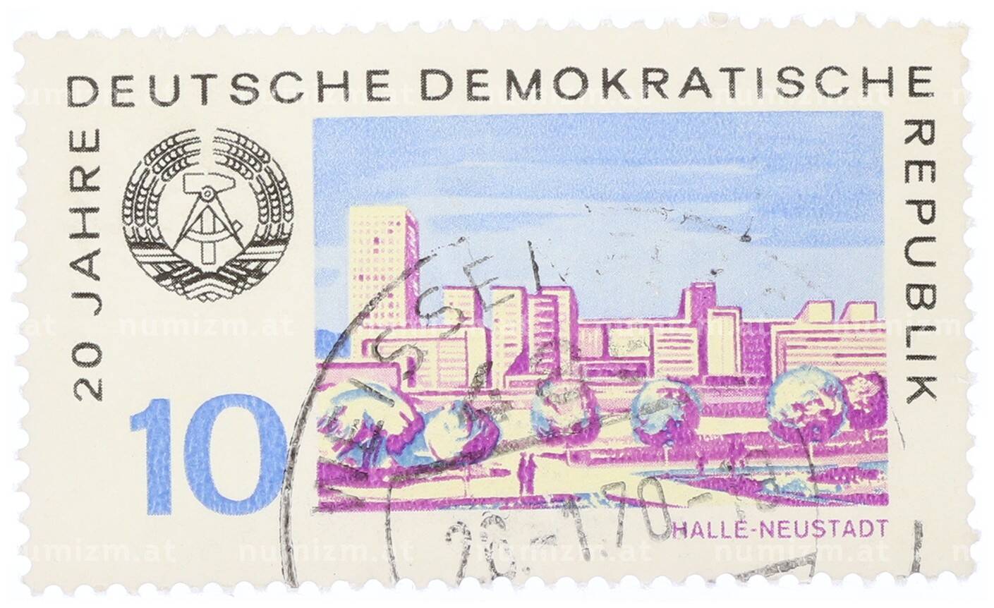Купить Почтовая марка 10 пфеннигов 1969 года Восточная Германия (ГДР) «20 лет ГДР — Галле-Нойштадт» по привлекательной цене можно в нашем интернет-магазине — Вам достаточно оформить заказ на сайте. Все монеты, представленные в каталоге, находятся в наличии на нашем складе.