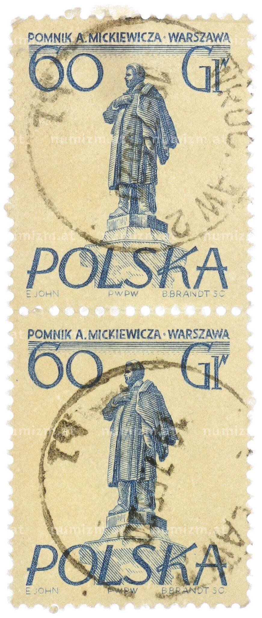 20.01.2025Интернет магазин «Нумизмат» предлагает приобрести Сцепка из 2 марок 60 грошей 1955 года Польша «Памятники Варшавы — Адам Мицкевич».