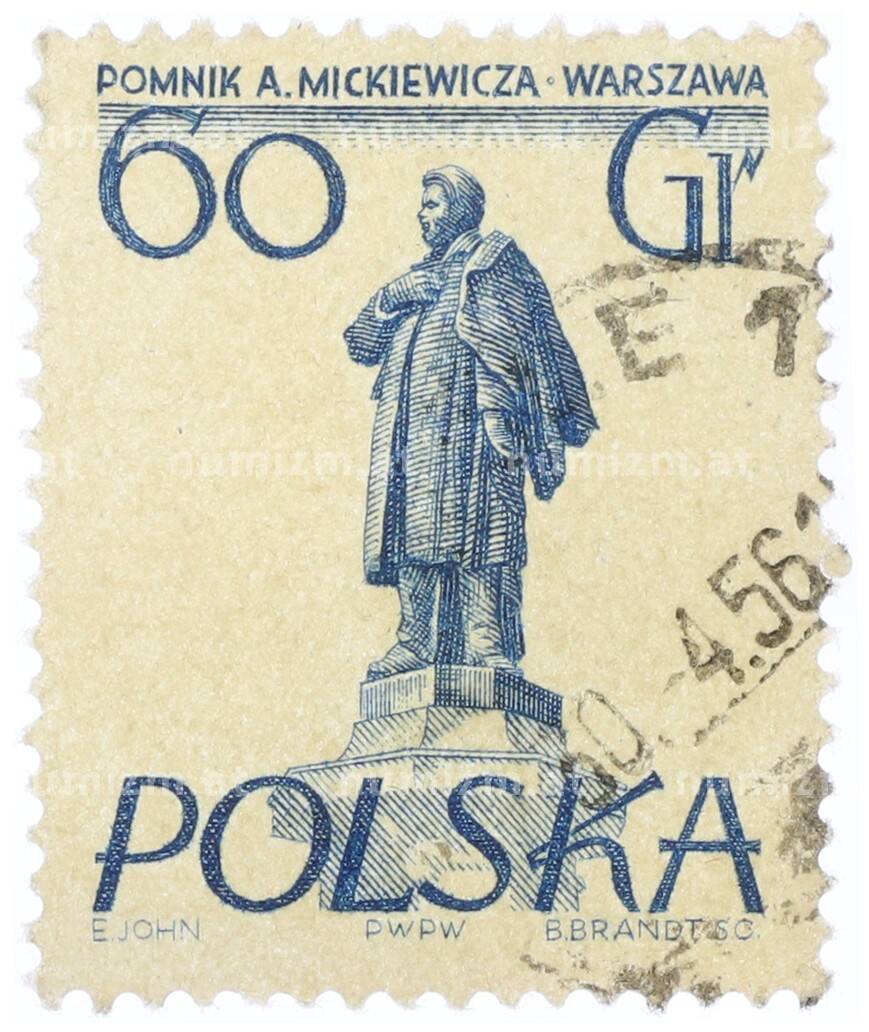 Интернет магазин «Нумизмат» предлагает приобрести Почтовая марка 60 грошей 1955 года Польша «Памятники Варшавы — Адам Мицкевич».